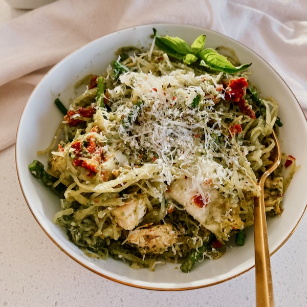 - Mix squash with chicken, pesto, marinara, salt, and pepper.