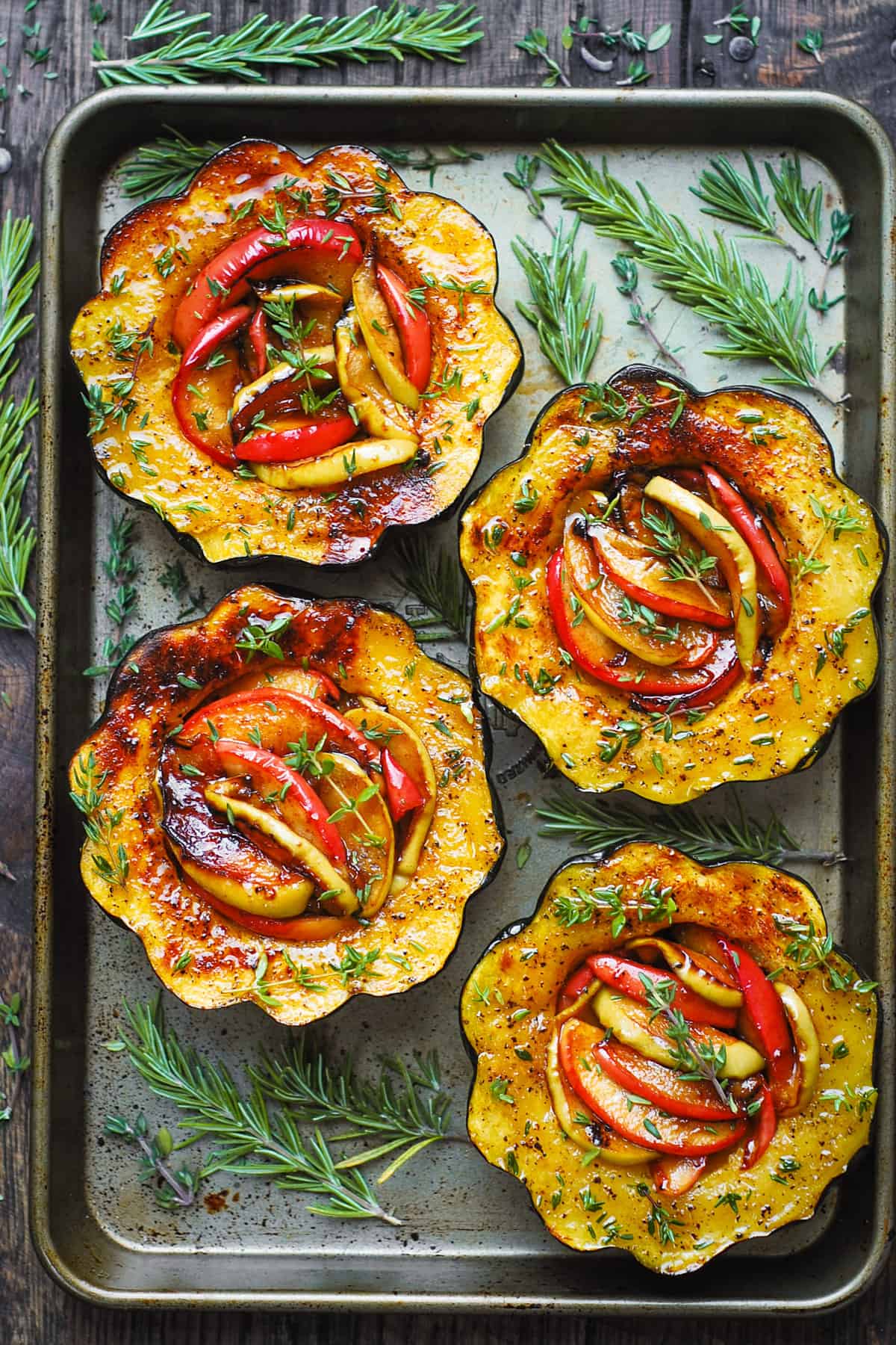 - Sprinkle fresh thyme over each stuffed squash. Optionally, drizzle any leftover juices from the apple bowl over the stuffed portions.