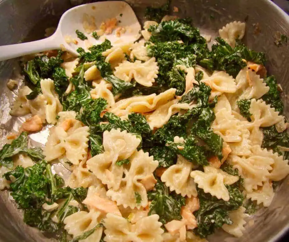 - Drain pasta, then add salmon and black pepper to the kale mixture. Toss pasta in sauce and serve immediately