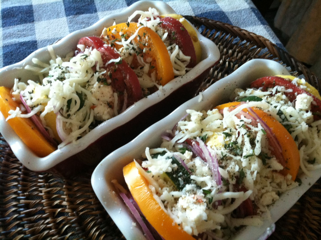 - Butter two mini rectangular baking tins. Create a stack of veggies and cheese: start with a slice of zucchini or squash, then a contrasting tomato slice, followed by a thin onion ring, feta, thyme, and mozzarella. Repeat layers until the stack fills the tin.